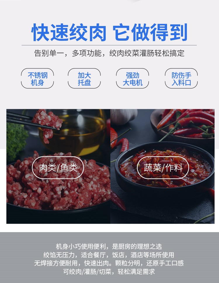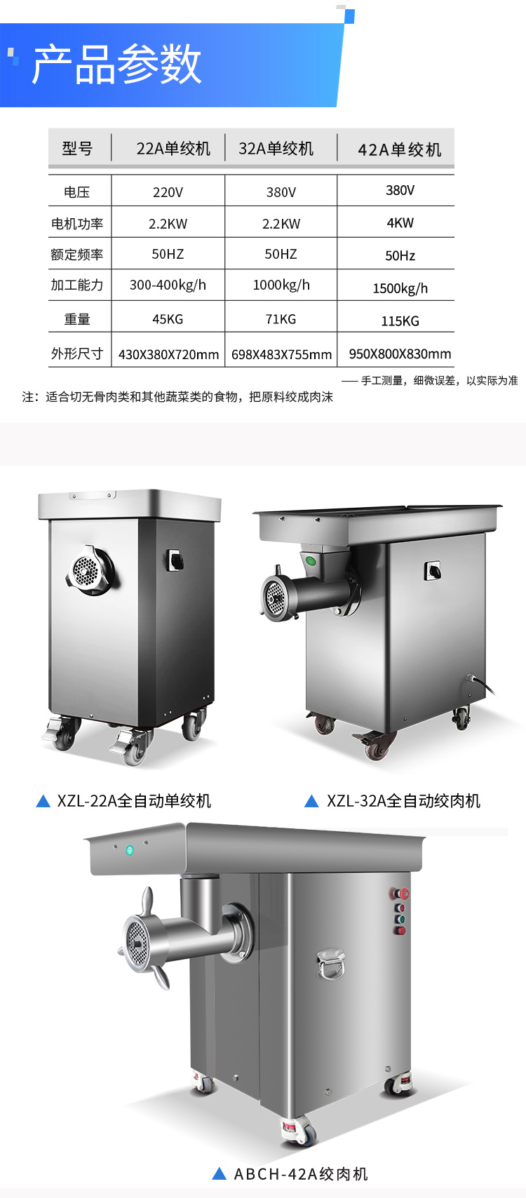 ABCH-42A单绞机是我厂精心研制出的新产品,该机时尚、简洁、清洗便捷。操作安全,配有风冷马达,适合连续作业;高质量全不锈钢机身、适应于酒楼、超市、工厂、学校、宾馆、食堂等各种肉类加工企业和个体用户使用。