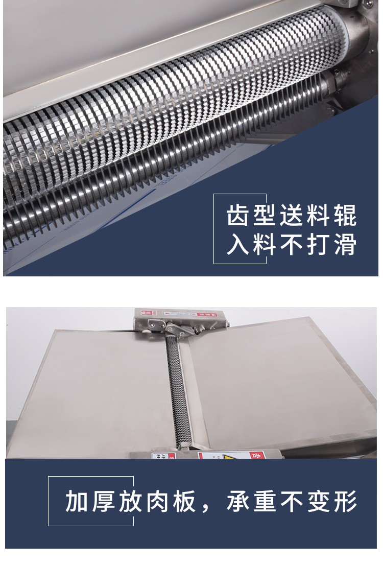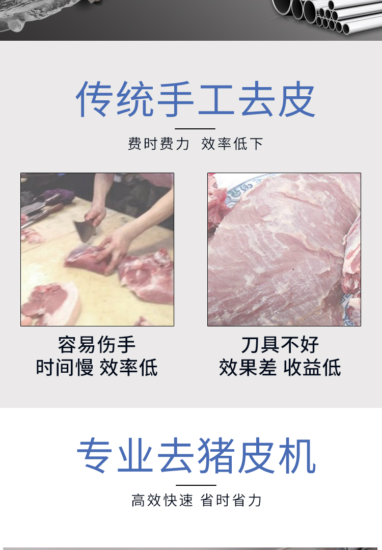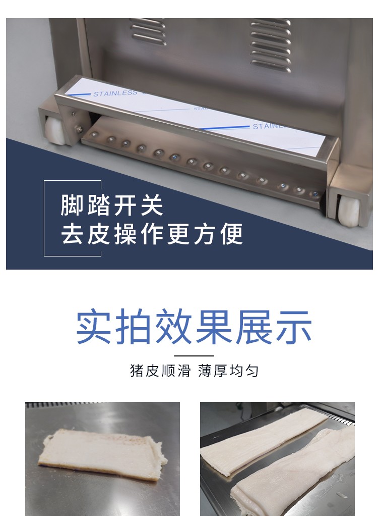 4.利用传送辊及锋利的刀片将猪肉去皮,去皮效果好,效率高。