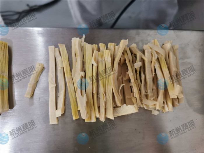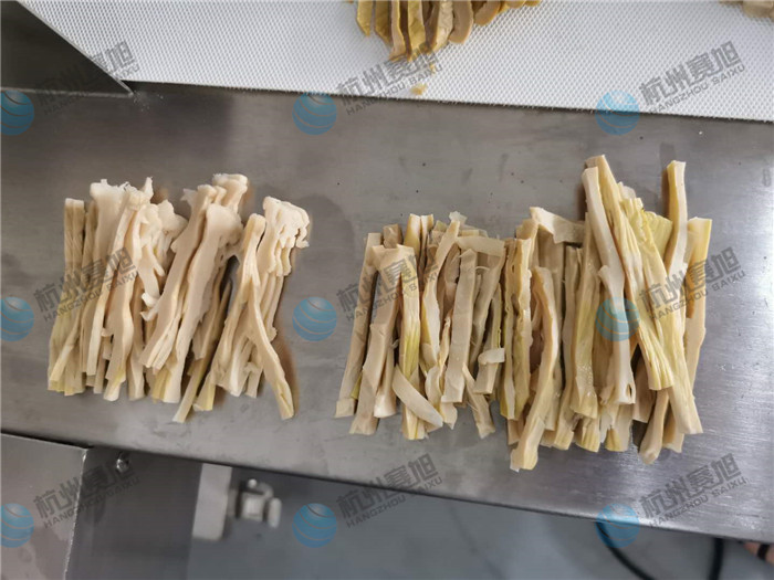 熟肉切片机,不管你还是肉类,或是蔬菜瓜果类,轻松拿捏,绝对给您切出你想要的片,成品也是片片分明,厚薄均匀,下面是前两天一客户来试机(切竹笋片)效果。