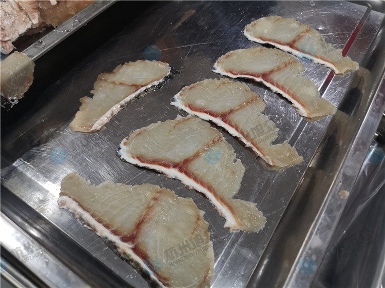 而且设备的适用范围是很广的:鲤鱼、鲢鱼、三文鱼、桂鱼、青鱼、草鱼、黑鱼、鲈鱼等,处理好前期工作后,是可以直接放入设备进行切片的,切的鱼片,厚薄均匀,工作效率同比手工是非常快的,解决了传统手工切鱼片费时费力效率低的问题。
