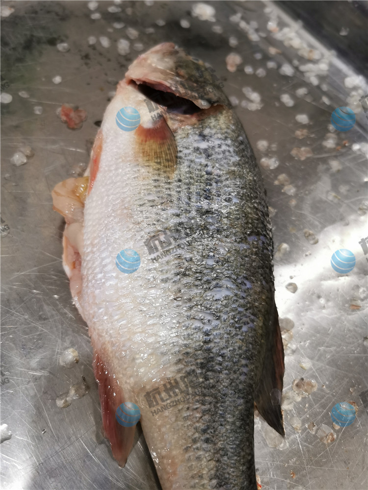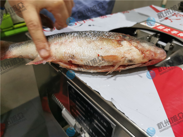 杭州客户亲自来厂试机,开肚去鳞杀鱼机——1.2斤鲈鱼开肚去鳞效果!