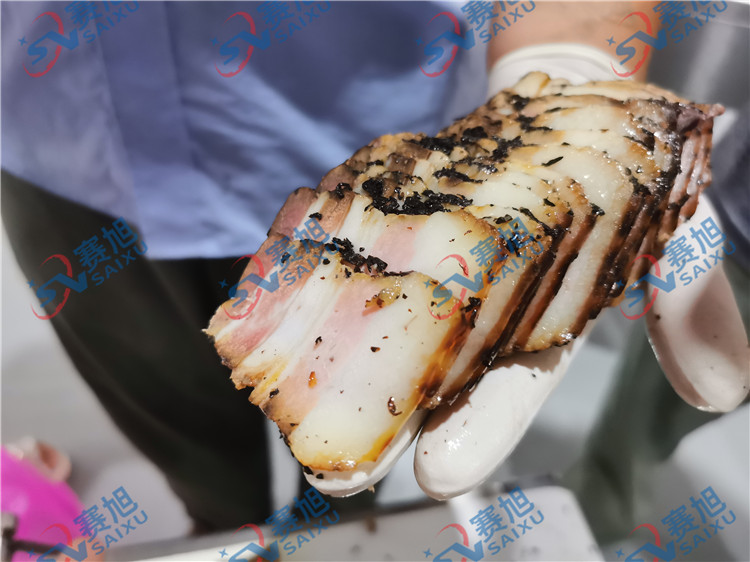 一客户带了几块梅干菜扣肉来到本厂试机,这客户他们的产量一天好机千斤,一直想买一台合适的设备去代替人工,因为人工的成本太高了,所以一直在选合适的设备,于是再网上看到我们公司的信息,联系到了我们,然后就安排来厂免费试机,设备呢也没让客户失望,客户当场定购设备,直接提货!来看看效果有多好: