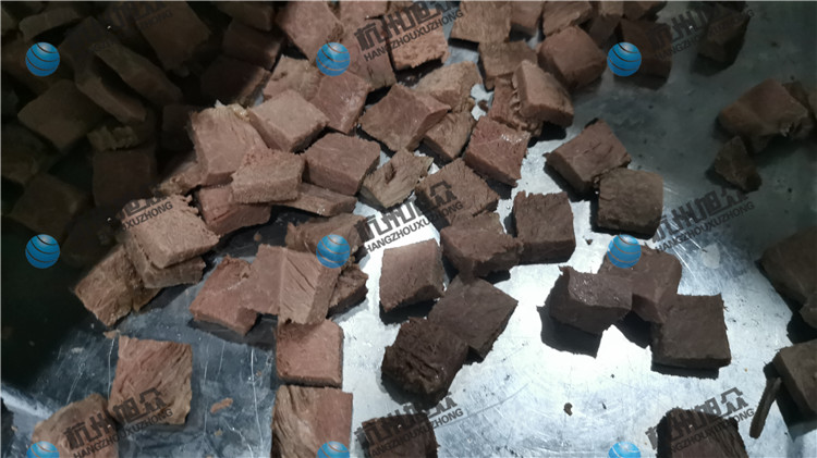 今日客户自带熟牛肉亲自来厂试机看效果,用切丁机切熟牛肉丁,看看效果如何吧!