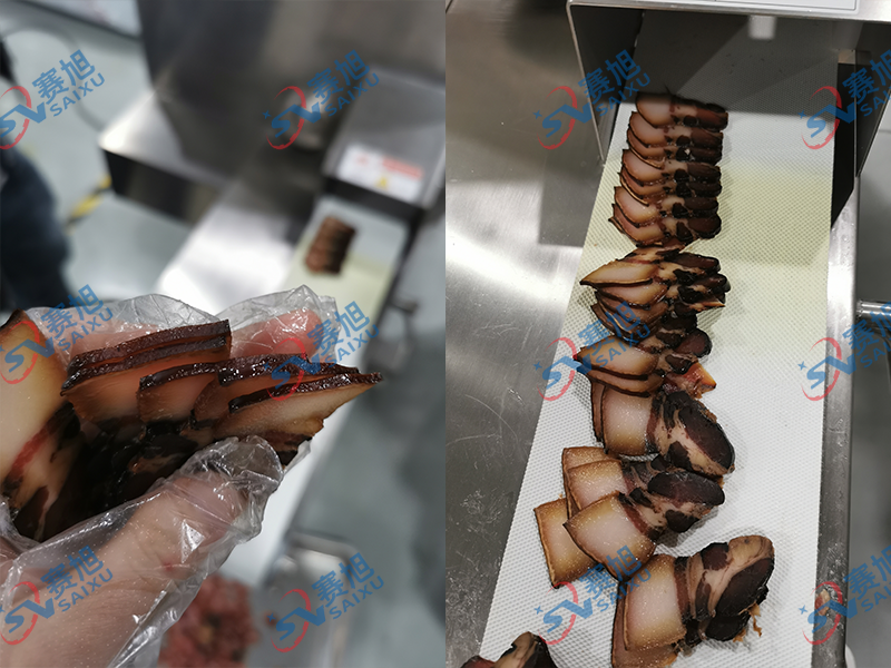 多功能熟肉切片机能将各种不带骨的肉类,如扣肉、牛扒、五花肉、熟肉、火腿、香肠等切成片状或块状,切片均匀高效,厚薄均匀。熟肉切片机厚薄度可调节,可切多种物料:叉烧肉、腊肉、五花肉、牛肉、卤味、熟肉类以及一些根茎类萝卜,土豆,黄瓜,莲藕,辣椒,苦瓜,丝瓜,西葫芦。下面是客户自己带的卤过的腊肉和香肠到我们公司现场试机的,对于试机效果也是很满意,感叹机器切的就是漂亮,卖相都更好了!