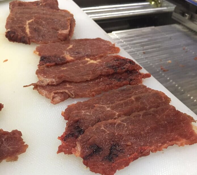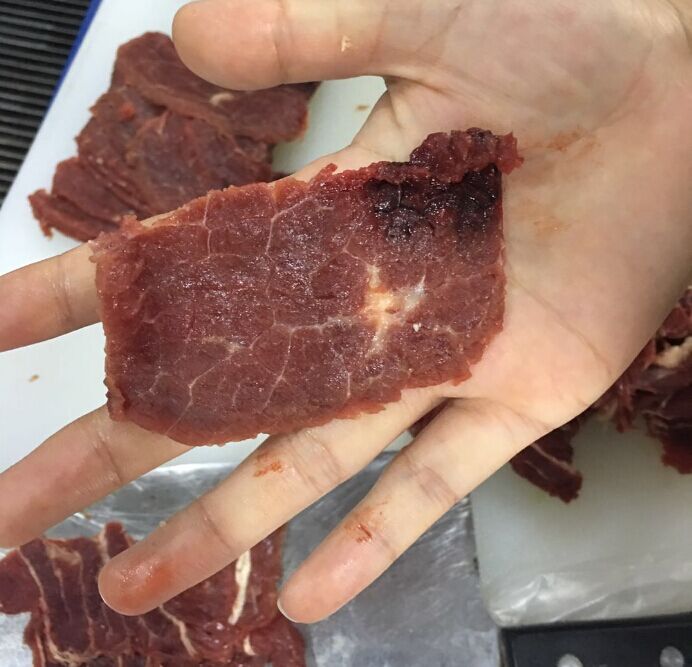 全自动切鱼片机模拟手工切片的原理采用变速箱传动,自动进料的原理,自动研制而成。适合于斜切三文鱼,鱿鱼等等鱼类或者斜切猪肚牛肚牛肉等肉类;牛肉加工厂等需大量切牛肉片的客户可以考虑使用全自动切鱼片机,该机不仅完善了人工单刀切片效率慢和不均匀的难题,还实现了多片斜切肉片。以下是某牛肉加工厂专用旭众切鱼片机切牛肉片的效果,如看图不信可来杭州旭众实地考察,自备物料现场试机查看切牛肉片效果!预约客服热线400-885-2117