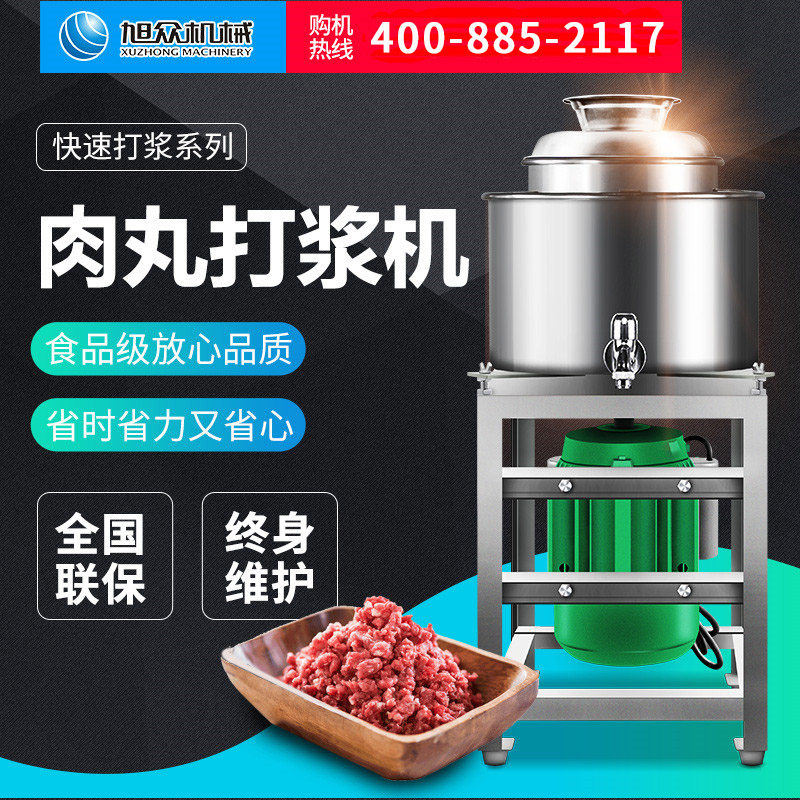 杭州旭众肉丸打浆机:机器具有美观大方,坚固耐用,操作维修方便,高效省电等特点,是加工猪肉丸,牛肉丸,鱼丸之理想设备自问世以来备受用户欢迎,打浆机装肉量为5-25公斤(大、小型)。开机15-30分钟即可完成打肉、配料、搅拌成浆,比你们手工捶打的肉浆精细,还不费力,所产出来的得肉丸、鱼丸、弹性好、色泽洁白。干净、卫生、安全,是你做各种肉丸最好的选择。