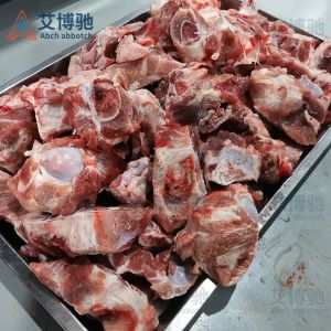 艾博驰ABCH-QGJ600自动切骨机针对大骨头量身定制的一款设备,可以对牛脊骨,羊脊骨,猪脊骨,猪脚等骨头大、硬的食材完成切块需求,连续投料,不间断工作,大大提升了传统人工效率慢,成品大小不规则的问题,刀片采用斜刀设计,工作原理类似剪刀,增加了刀片的使用寿命。
