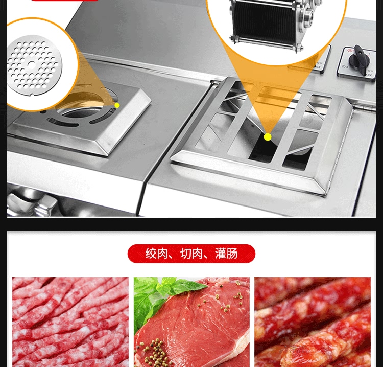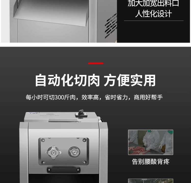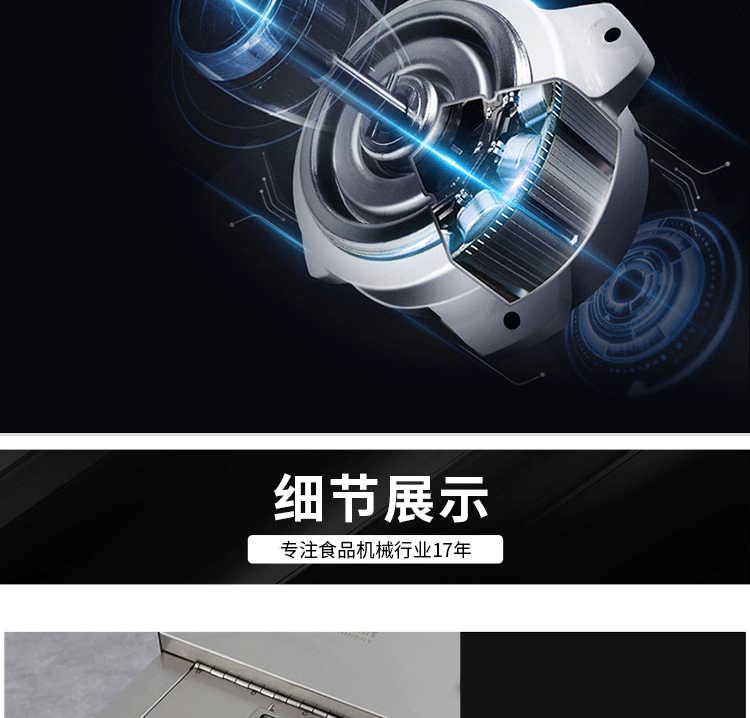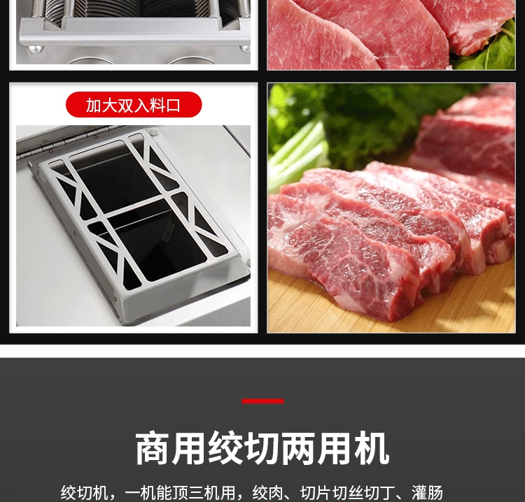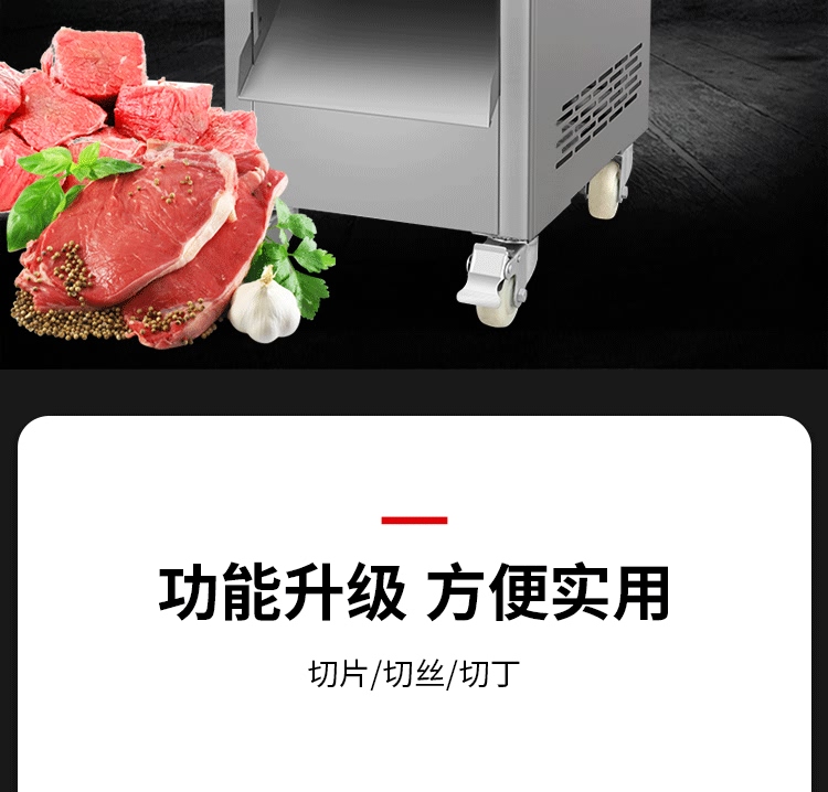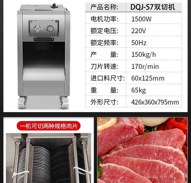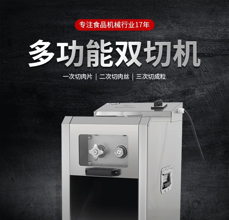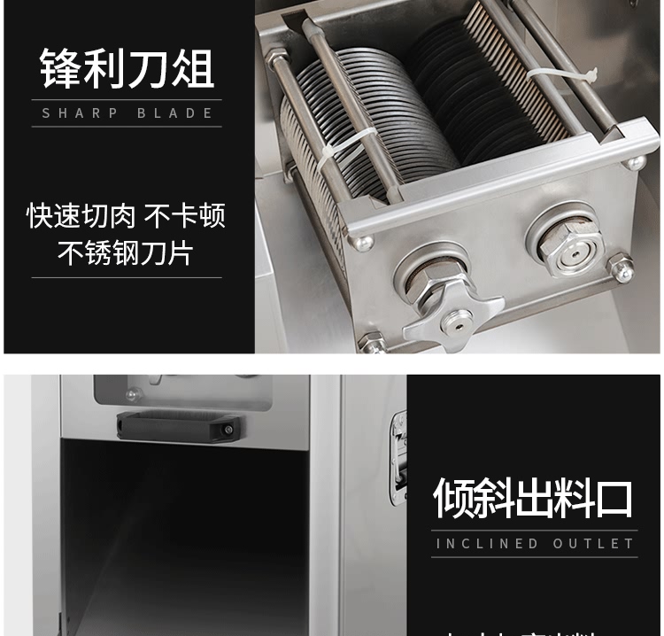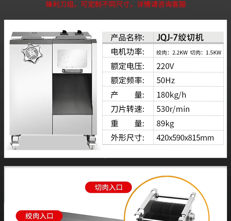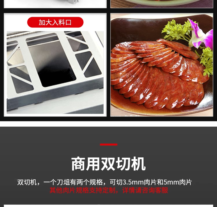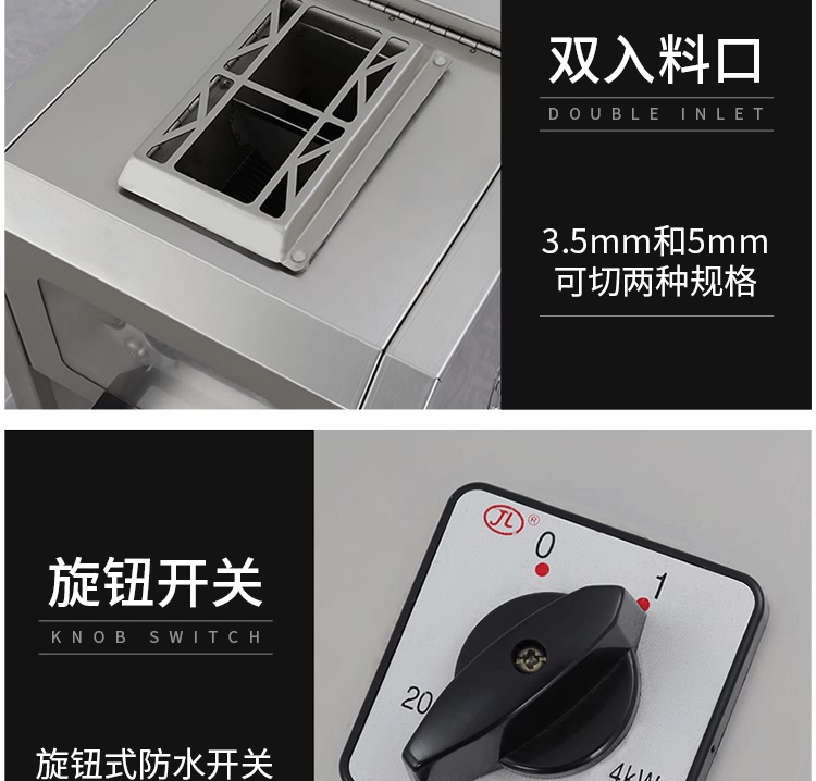 艾博驰ABCH-7P切片机/S7双切机(15秒可拆卸刀组,加厚3毫米全不锈钢机身,)国标全铜电机,105mm直径大刀片人性化提手,增加散热口,升级不锈钢螺母,无需齿轮。(便宜的尼龙齿轮容易坏),一切成片,2切成丝,多切成末。安全下料口,入料口安全挡板。橡胶承重轮。标配3.5毫米(标配3.5mm往下只有3mm和2.5mm两个规格可订做,均需加改装费),标配3.5mm往上4mm开始加0.5mm进制,最大可以订做到20mm,不加改装费
