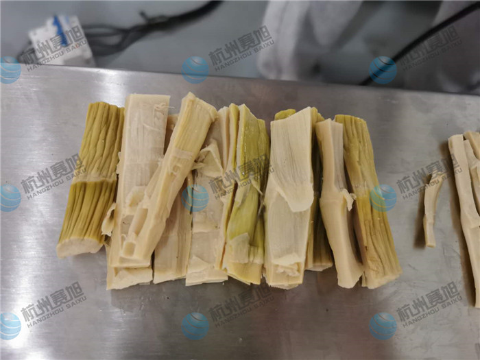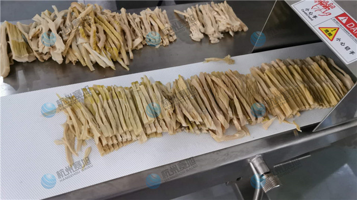 熟肉切片机,不管你还是肉类,或是蔬菜瓜果类,轻松拿捏,绝对给您切出你想要的片,成品也是片片分明,厚薄均匀,下面是前两天一客户来试机(切竹笋片)效果。