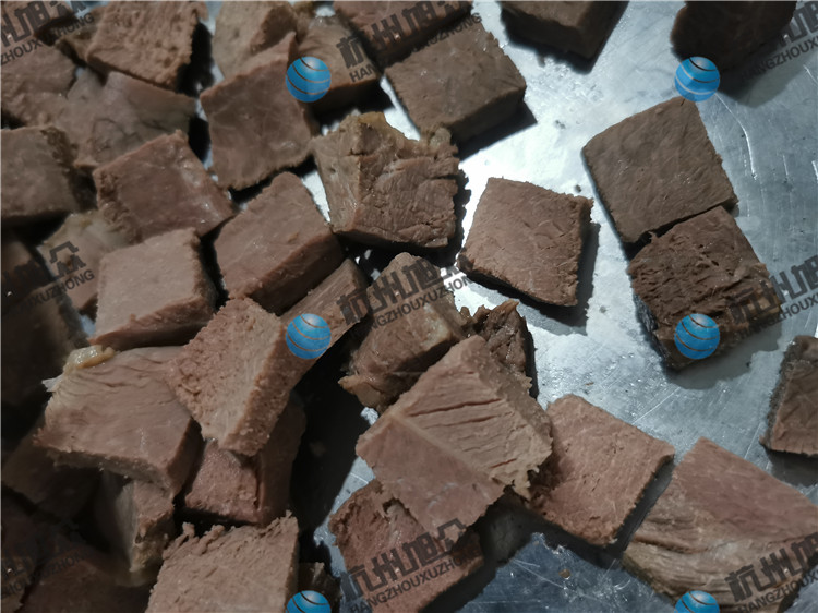 今日客户自带熟牛肉亲自来厂试机看效果,用切丁机切熟牛肉丁,看看效果如何吧!
