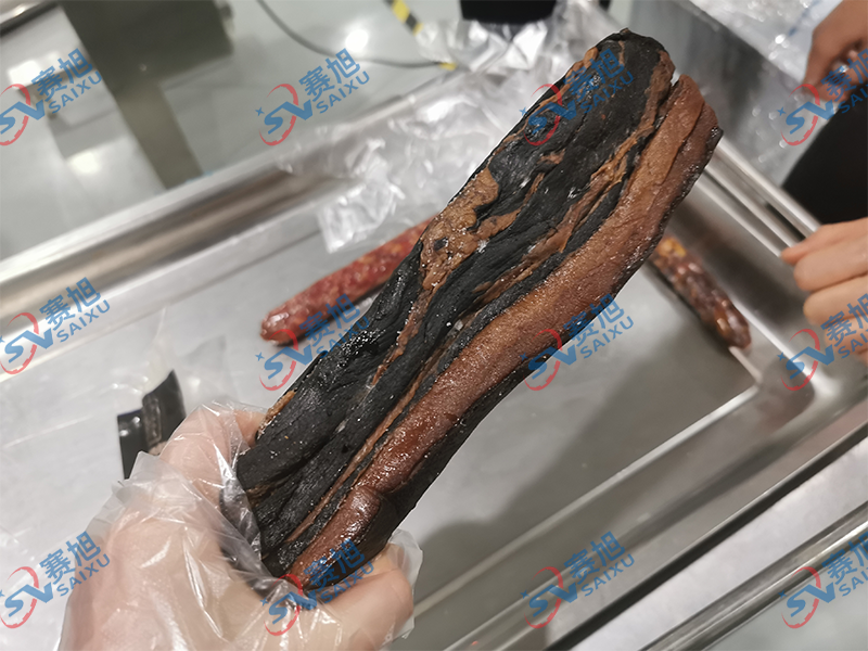 多功能熟肉切片机能将各种不带骨的肉类,如扣肉、牛扒、五花肉、熟肉、火腿、香肠等切成片状或块状,切片均匀高效,厚薄均匀。熟肉切片机厚薄度可调节,可切多种物料:叉烧肉、腊肉、五花肉、牛肉、卤味、熟肉类以及一些根茎类萝卜,土豆,黄瓜,莲藕,辣椒,苦瓜,丝瓜,西葫芦。下面是客户自己带的卤过的腊肉和香肠到我们公司现场试机的,对于试机效果也是很满意,感叹机器切的就是漂亮,卖相都更好了!