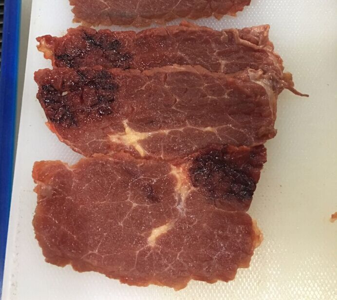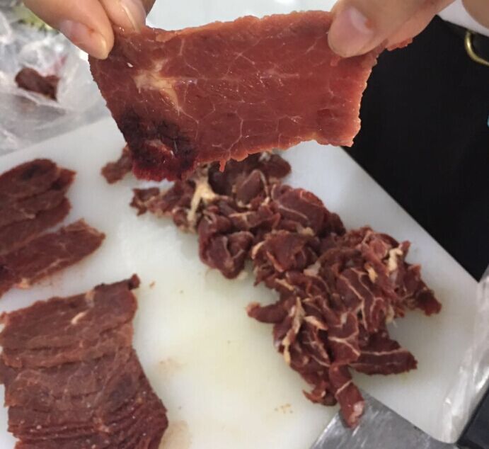 全自动切鱼片机模拟手工切片的原理采用变速箱传动,自动进料的原理,自动研制而成。适合于斜切三文鱼,鱿鱼等等鱼类或者斜切猪肚牛肚牛肉等肉类;牛肉加工厂等需大量切牛肉片的客户可以考虑使用全自动切鱼片机,该机不仅完善了人工单刀切片效率慢和不均匀的难题,还实现了多片斜切肉片。以下是某牛肉加工厂专用旭众切鱼片机切牛肉片的效果,如看图不信可来杭州旭众实地考察,自备物料现场试机查看切牛肉片效果!预约客服热线400-885-2117